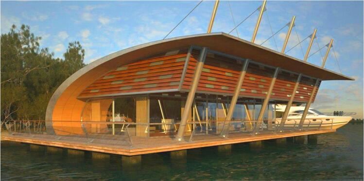 水上建筑設(shè)計適宜采用通透的建筑外殼,輕盈的建筑造型,因此該水上運動中心建筑設(shè)計采用現(xiàn)代風(fēng)格,采用鋼架結(jié)構(gòu)的形式,建筑材料專用采用鋼構(gòu)架、防腐木和玻璃,屋頂設(shè)計采用流線型,挑出屋頂?shù)闹雍弯摻z拉線與現(xiàn)狀水上高爾夫的張拉膜結(jié)構(gòu)形成統(tǒng)一風(fēng)格。